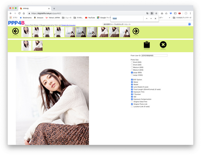 ブログ記事を書くときは、昔自分で作ったPPP4B(Picture Pick’n’Paster 4 Blogger)で、Flickrにアップした写真を選んで並べて、貼り付けコードを自動生成しています。Flickrサイトがパンダ化(メンテナンス中)していてもAPIは使えたりしますからね。昨年末にWordPressを5.02にアップして編集画面がブロックエディタになってからは写真を見ながらコメントできるようになったのは良いですが、EXIF情報が段落ブロックになってしまうので、画像のキャプションになるように修正したサイトを公開しました。