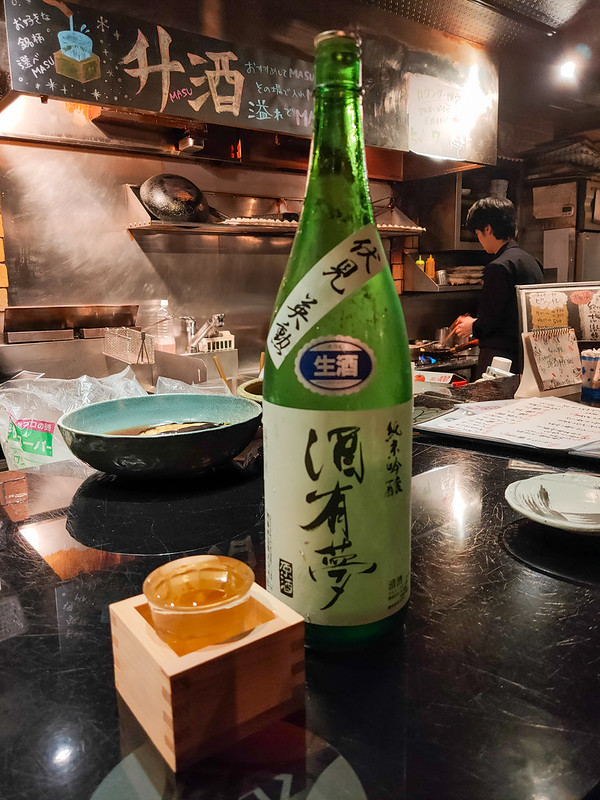日本酒もいろいろ置かれているので、飲んだことのない伏見の日本酒「酒有夢」を。辛口ですが香りもしっかりします。