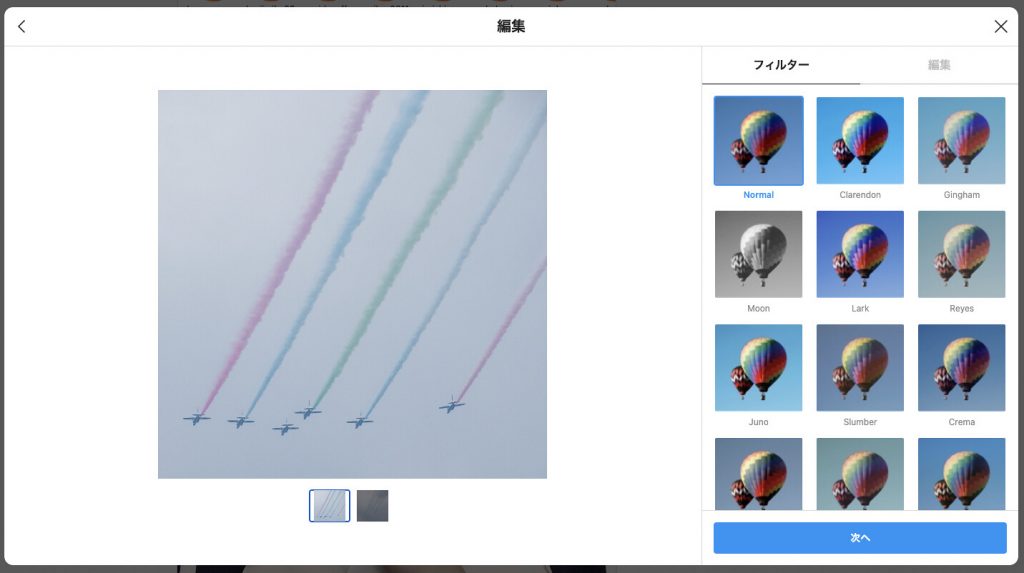 Instagramの右上の「+」ボタンを押すと新規投稿のポップアップが出るので、そこに写真をドラッグ&ドロップするか、ファイル選択で投稿する写真を選びます。