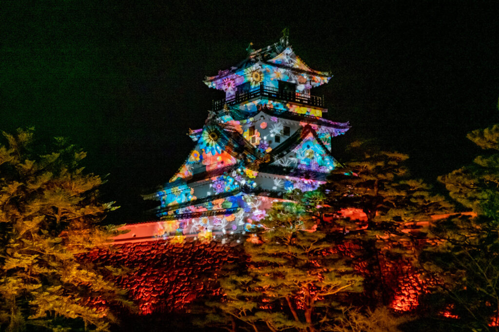夜の高知城ではちょうど「NAKED FLOWERS 高知城」が11/19から1/10まで開催中。お城EXPOでお城プロジェクションマッピングワークショップなどを開催していたNAKED, INC.の花の体験型アート展です。