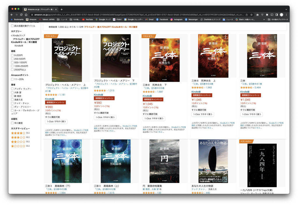 7/12-13のAmazon プライムデーに先立って、最大70%OFF Kindle本セールが開催されています。注目は、早川書房のSFタイトルが50%オフになっているところ、「三体」シリーズや「プロジェクト・ヘイル・メアリー 」などが半額で購入できます。