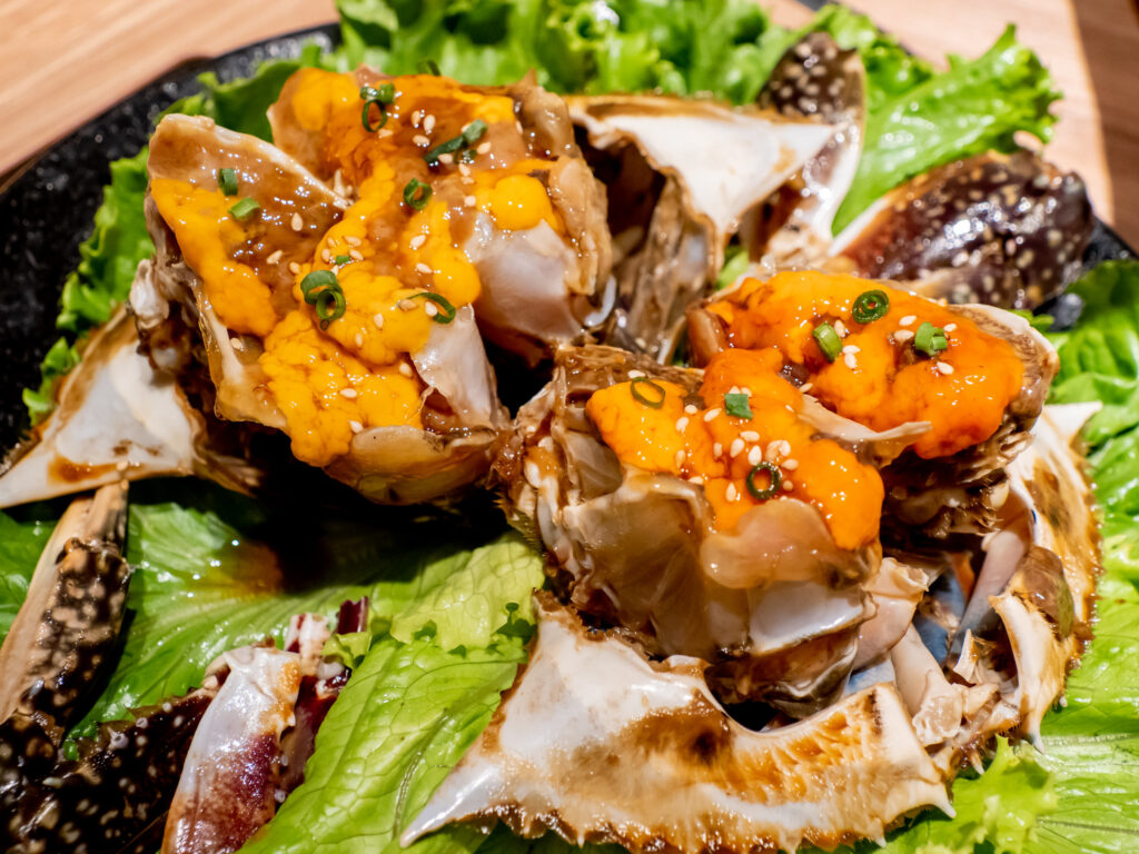カンジャンケジャンは要予約ですが、食べたかったので予約しておきました。生の蟹身の上にカニ味噌が盛り付けてあって見た目はうに軍艦のよう。手袋をして、両手で蟹身を取りながらしゃぶりつきます。少し食べにくいですが美味しさは格別。