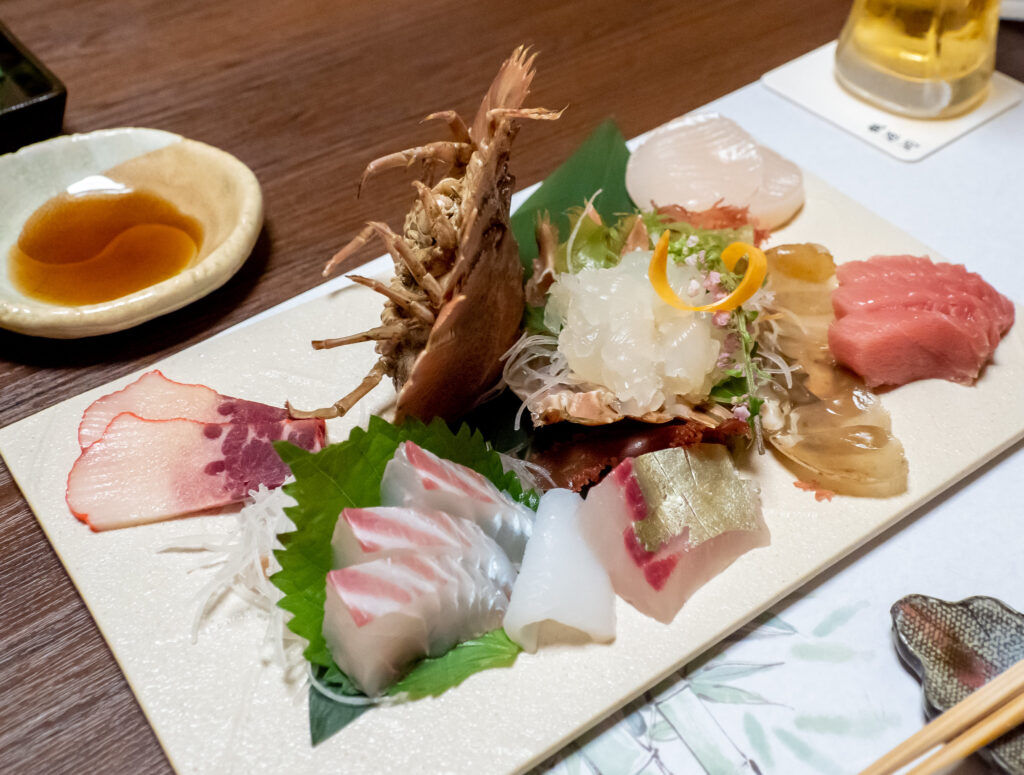 出てきた刺盛りはとても豪華。直前まで生簀で生きていたうちわ海老に、鯨ベーコン、石鯛、水いか、縞鯵、鮪、ホタテ貝柱。