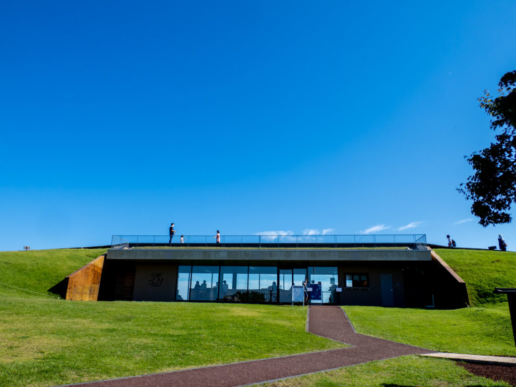 小室山リッジウォークにあるおしゃれなカフェ「Café・321」。席からは、青い海と空を楽しめます。