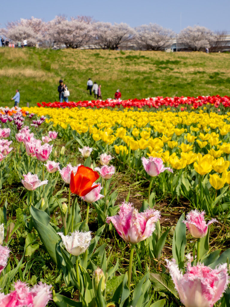 荒川河川敷にとても多くのチューリップの花が並んでいます。