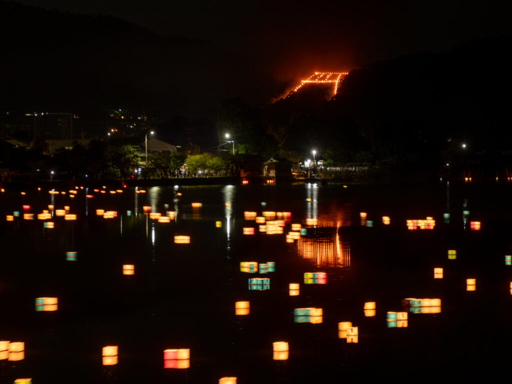 やっぱり送り火と灯籠流しのコラボは幻想的ですね。多くの観客もただ静かに観ていました。