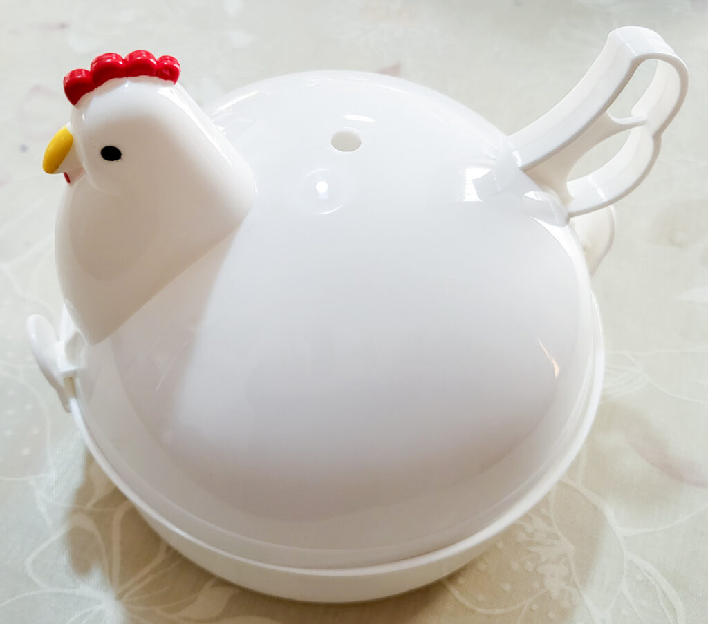 かわいいにわとり型のゆで卵器を開けると中にアルミ製のプレートが入っています。こちらを外して水を水位線まで入れて卵を1〜4個入れて蓋をして、電子レンジで加熱するだけ。