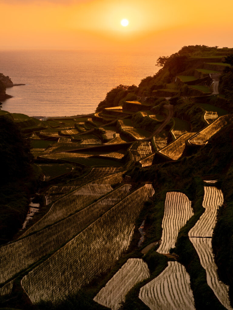 名護屋城跡のあとは、浜野浦の棚田へ。4月中旬の水張りから5月上旬の田植えまでの棚田の水面に映る夕日が有名ですが、6/1でもまだ苗の間の水面に反射する夕日がきれいでした。