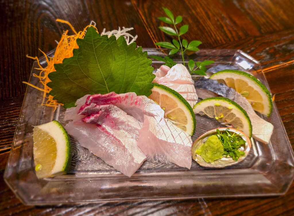 刺身はどれも新鮮で、旨味たっぷりです。甘みが強い九州の醤油でいただきます。