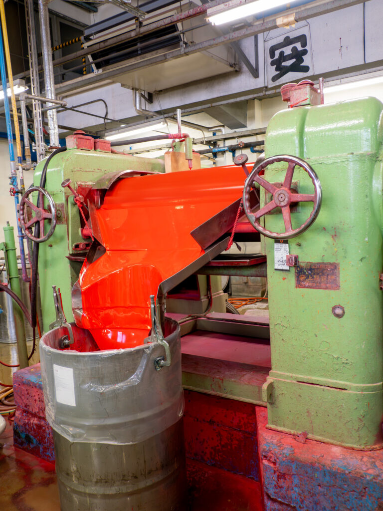 原料の顔料・糊を混ぜ合わせたものをポンプで吸い取り、