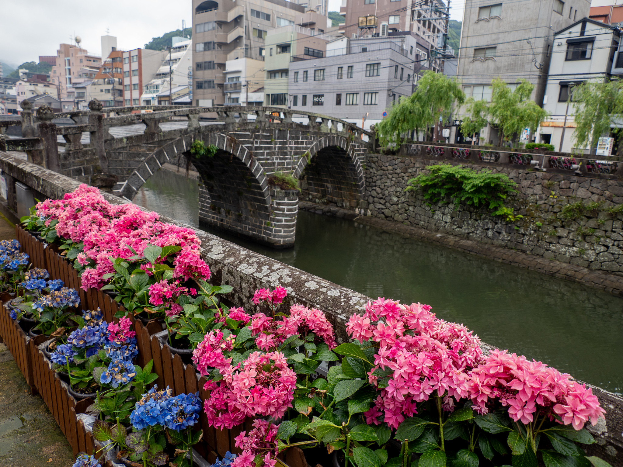 眼鏡橋の周りには紫陽花がたくさん植えられていますね。多彩な紫陽花が咲いています。